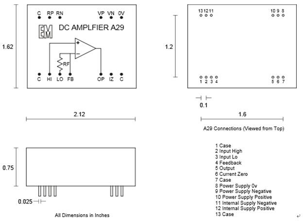 A29可以通过13针的管脚安装在印刷电路板上,管脚间距0.1英寸,安装尺寸为1.6×1.2英寸。放大器密封在不锈钢壳体中,这使A29具有电磁屏蔽和热隔离效果。
