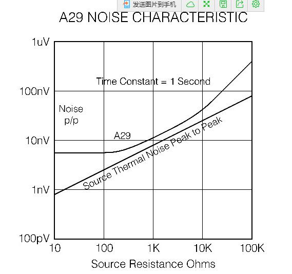 在源电阻从等效噪声电阻值至50kΩ的范围内,A29遵循热噪声特性。当源电阻在1kΩ至50kΩ的范围内,总噪声仅比源噪声略为增加,每十倍频噪声增加10dB。在源电阻高于50kΩ时,噪声每十倍频增加10dB,因此总噪声每十倍频增加20dB。在源电阻低于1000Ω时,电压噪声为常数。放大器等效噪声电阻为700Ω。