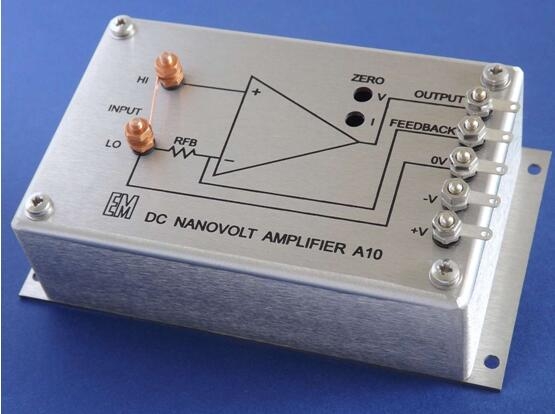 The EM A10 is a low level amplifier module for sensitive measurements, data collection and systems, where signals below 1 nanovolt may be measured. It is ideal for the input unit for precision voltage measuring systems, requiring voltage sensitivity for measuring low noise and low impedance sources. The noise level of the A10 is equivalent to a perfect resistor of about 20 ohms. When used with a digital voltmeter, steady one nanovolt digits may be displayed, with a response time constant of less than a second. The input voltage stability of the A10 is very high, with the drift around a nanovolt per degree C. The input connectors are made from pure copper. The input impedance is very high, and is time dependent, determined by the loop gain.