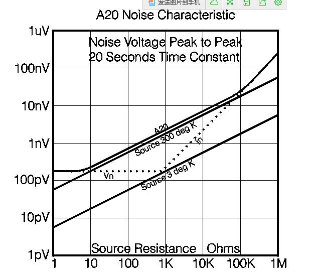 需要注意A20所适用的源电阻范围,特别是在测量低温源时。在源电阻与电压噪声的关系图(图1)中,将温度为300K时的电压噪声线和电流噪声线抽离,得到温度为3K时的热噪声曲线。可以看到,A20在室温下依然有效地测量在氦温度下的源,而不显著增加整体噪声。