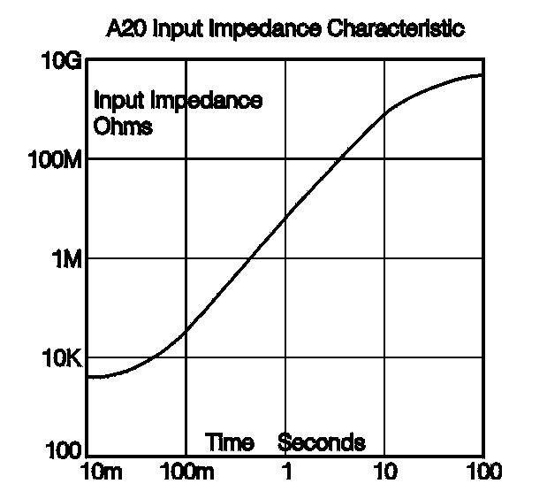 Greater than 30 Megohms, 3 seconds after an input step increasing with time to 1 Gohm, see input impedance graph