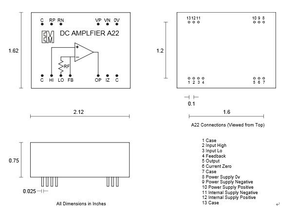 The A22 is designed to be mounted on a printed circuit board, using a 0.1&O5533; grid, with 13 pin connections on a rectangle 1.6&O5533; X 1.2&O5533;, and is built into a heavy gauge mumetal case which gives it very good magnetic, electrostatic and thermal immunity from interference. A printed circuit board is available which provides connections for power supply, gain, filter capacitors and outputs. It also contains controls for voltage and current offsets, power supply de-coupling and a passive output filter to reduce any modulation by-product.