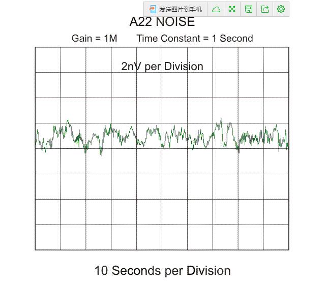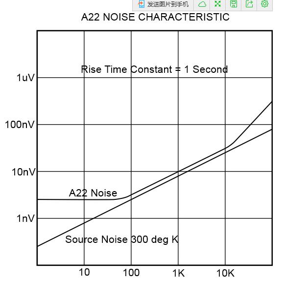 在源电阻为150Ω至10kΩ的范围内,A22遵循热噪声特性。且在这个范围内,总噪声仅比源噪声略为增加,每十倍频噪声增加10dB。在源电阻高于10kΩ时,噪声每十倍频增加10dB,因此总噪声每十倍频增加20dB。在源电阻低于150Ω时,电压噪声为常数。